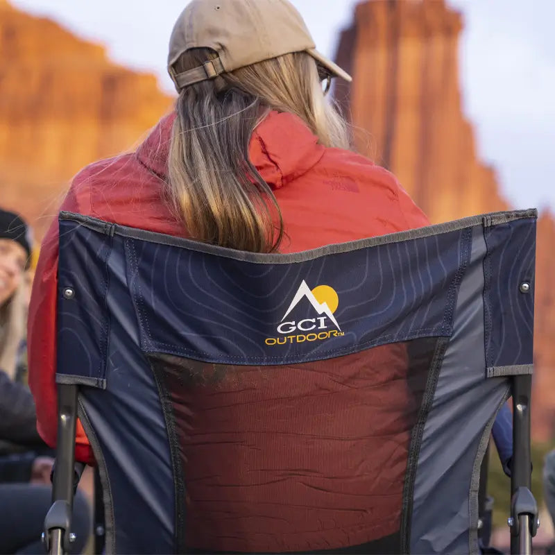 Man lounging in a Firepit Rocker near a tent, gazing out across a canyon landscape while holding a drink.